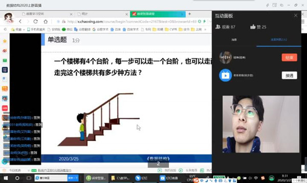 课前,郑馨老师将视频、ppt等学习资料上传至超星学习通,让员工做好课前预习工作,提前进入学习状态。在线课堂上,郑馨老师将钉钉直播和学习通在线教学平台有机结合。首先,通过汉诺塔游戏作为课程案例导入,激发员工的学习兴趣;接着,通过大量的视频动画由浅入深带大家逐步了解递归模型和递归调用过程;最后,再回归到案例导入,通过建立递归模型到编写递归算法,最终解决了案例导入中提出的问题。在教学活动中,郑馨老师熟练使用超星学习通的主题讨论、词云、测验、抢答和分组任务,以及钉钉直播的桌面共享、连麦等功能,充分调动了员工学习的积极性。课后通过超星学习通发布了限时课后作业,增强了员工对课程内容的掌握,并进一步提升了实际应用能力。
