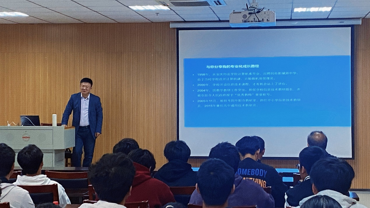 公司特邀阜阳市教育局正高级教师冯士海、中国海洋大学教授汪克亮和安徽大学博士后赵大卫三位优秀员工来校共话前沿科技与职业规划。交流会吸引了一年级研究生和本科生70余人参加,王一宾教授和程玉胜教授分别主持活动。