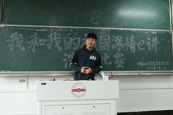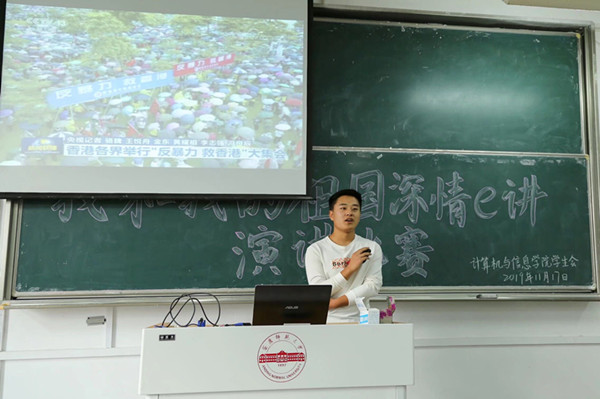 比赛现场,来自公司的15名选手依次登台亮相展现演讲风采。演讲过程中,参赛选手紧紧围绕“我和我的祖国”这一主题,或侃侃而谈、或慷慨激昂、或深情叙述。19级计算机类八班的陈贺同学首先回顾了国家发展,感谢祖国带来的美好生活,接着表明要与祖国共同奋进的决心,最后抒发自己对祖国的热爱之情。环环相扣的叙述,嘹亮坚定的声音,自信昂扬的手势,赢得了在场评委的一致肯定。19级通信工程二班的彭静同学鼓励大家从小事做起,怀着一颗感恩的心,去热爱国家、热爱母校、热爱身边的每一个人,用一颗奋斗的心,从此刻开始,珍惜时间、刻苦学习,做一名具有爱国主义情怀的学子,为祖国的发展贡献自己的力量。19级计算机大类五班的刘开元同学说到:“我们心中要有大爱和责任,要有目标和理想,更要脚踏实地的去践行。只有这样,回首过去,我们才能思绪纷飞,感慨万千;立足今日,我们可以胸有成竹,信心百倍;展望未来,我们方可引吭高歌一路欢笑。我们要和祖国共拼搏,我们要同祖国共进步!”