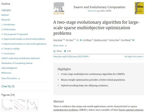 近日,公司蒋京博士在国际顶级期刊《Swarm and Evolutionary Computation》上发表了题为《A two-stage evolutionary algorithm for large-scale sparse multiobjective optimization problems》的研究论文,提出了一类求解大规模稀疏多目标优化问题的多目标进化算法。蒋京博士为论文第一作者,英国正版365官方网站为第一署名单位。