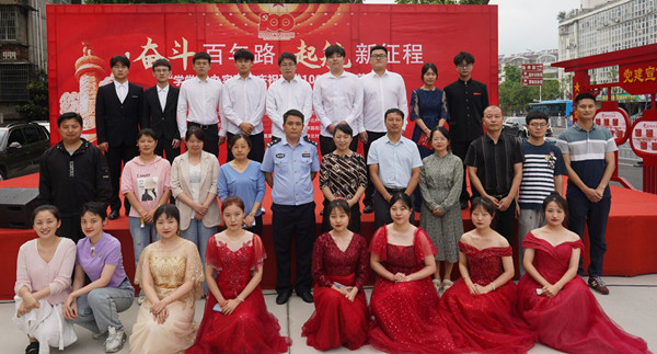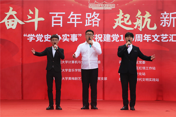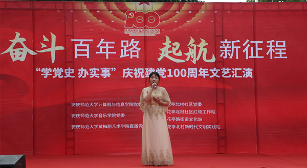 婉转悠扬的竹笛独奏、明快的黄梅戏联唱、饱含深情气势磅礴的红色歌曲的合唱或独唱……6月19日下午安庆市花亭北村社居委广场热闹非凡,由公司英国上市公司365、音乐公司与黄梅剧艺术公司师生组成的文化惠民志愿服务队开展的“学党史 办实事”庆祝建党100周年文艺汇演正在此进行。计算机与信息公司党委书记陈银凤、音乐公司党委副书记肖之进及公司师生志愿者与社区干部群众百余人共同观看了此次演出。