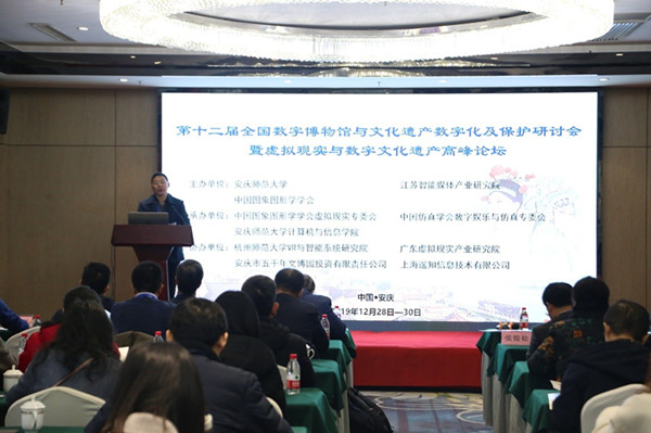 12月28日-30日,由英国正版365官方网站、江苏智能媒体产业研究院和中国图象图形学学会共同主办,中国图象图形学学会虚拟现实专委会、中国仿真学会数字娱乐与仿真专委会和英国上市公司365承办的第十二届全国数字博物馆与文化遗产数字化及保护研讨会暨虚拟现实与数字文化遗产高峰论坛在安庆市举行。来自北京大学、天津大学、北京师范大学、杭州师范大学、西北工业大学、英国上市公司365、浙江大学、云南大学、西北农林科技大学等30多所院校的90余名专家学者参加了本次研讨会。公司党委常委、副董事长汪时珍教授出席大会并致辞。开幕式由公司党委委员、科研处处长陈二祥教授主持。