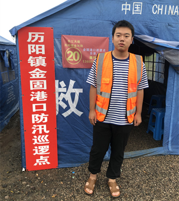 2018级计算机科学与技术2班的于怀泉同学在家乡防汛一线马鞍山市和县金固港口附近江堤彻夜奋战着,于怀泉担任了巡堤工作,逐一巡查防汛站点,查看各个站点之间的情况,检查是否存在漏水现象。站点之间来回最低一个小时的路程,于怀泉也从未喊过苦叫过累。谈起这些天的巡堤经历,于怀泉表示:“巡堤的工作虽然看起来简单,却不容一丝马虎。家乡这次汛情严重,为保卫家园做一些力所能及的事情是青年该有的担当。”