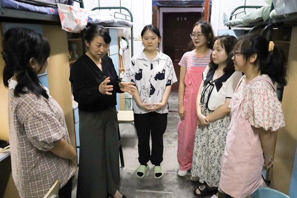 走进517寝室,看到几位员工正围成一圈,畅谈开学的所见所闻。陈银凤对融洽且活跃的寝室氛围提出表扬。她向员工讲述了公司某寝室“八朵金花”考研上岸的事迹,并对她们提出期待:“希望四年后,我能够看到你们寝室考研进入理想大学,谱写‘六朵金花’的故事。”