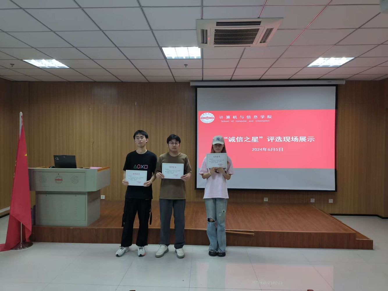 活动分为初赛和决赛两个环节。经过线下纸质材料初审,20名员工进入线下决赛展示环节。决赛现场同学们通过视频、PPT等方式充分展示了自己在学习和生活等方面的优秀事迹和优良品行,他们一致承诺在今后的历程中将继续秉持诚信自强的精神,脚踏实地做人做事,奋发向上学习创新,积极参加志愿服务,以优异的成绩回报他人。最后,结合为期3天的线上投票,叶芳婷等3人获得“诚信之星”荣誉。